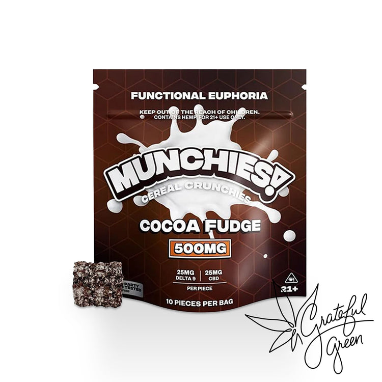 Delta Munchies Cereal Crunchies bring a nostalgic cereal‑bar format infused with a balanced 1:1 cannabinoid ratio of Delta‑9 THC and CBD. Each bag contains ten crunchy, marshmallow‑bound bites, each delivering 25 mg Delta‑9 THC paired with 25 mg CBD, for a total of 500 mg cannabinoids per bag. The texture and flavor combine real cereal and marshmallow sweetness with visible infusion, creating a snack‑forward edible experience rather than a traditional gummy.