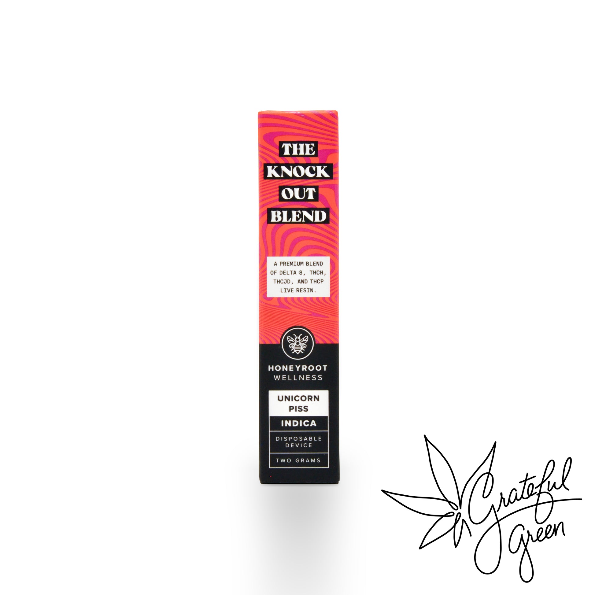 The Honeyroot Knockout Disposable features a blend of Delta 8, THCH, THCP, and THCjD in a 2g draw-activated device. It has an LED battery life indicator and is USB-C rechargeable. Available in flavors like Pineapple Express, Mango Kush, and Unicorn Piss, this disposable offers a strong and diverse vaping experience.